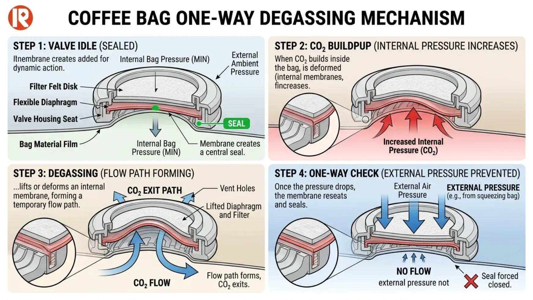 A Kaffeeventil ist ein gerichtetes Entlüftungsventil: Der Innendruck öffnet das Ventil, der Außendruck nicht. Wenn sich CO₂ im Inneren des Beutels ansammelt, hebt es eine interne Membran an oder verformt sie, wodurch ein vorübergehender Durchflussweg entsteht. Sobald der Druck abfällt, schließt sich die Membran wieder und versiegelt.